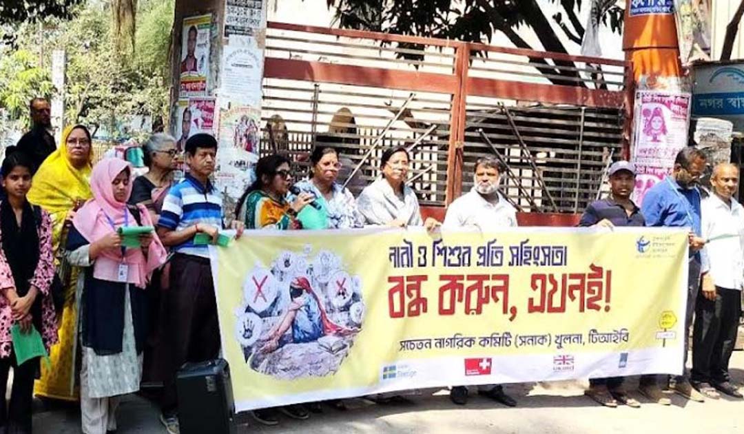 খুলনায় নারী ও শিশু ধর্ষণ এবং সহিংসতার বিচার ও নির্মূল করার দাবীতে মানববন্ধন অনুষ্ঠিত হয়েছে। রবিবার (১৬ মার্চ) দুপুরে নগরীর গোলক মণি শিশু পার্কের সম্মূখে টিআইবির সচেতন নাগরিক কমিটি সনাকের আয়োজনে এ মানববন্ধন অনুষ্ঠিত হয়। সনাক সভাপতি রমা রহমানের সভাপতিত্বে মানববন্ধনে বক্তব্য রাখেন, সনাক সদস্য অ্যাডভোকেট অশোক কুমার সাহা, শামীমা সুলতান, রিনা পারভিন, টিআইবির ক্লাস্টার কো-অর্ডিনেটর ফিরোজ উদ্দীন প্রমূখ।
