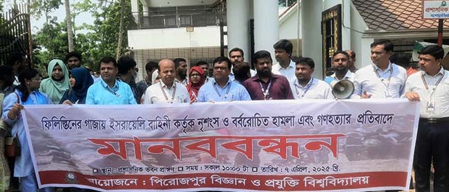 গাজায় ইসরায়েল বাহিনীর হামলা ও নৃশংস হত্যার প্রতিবাদে পিরোজপুরে বিজ্ঞান ও প্রযুক্তি বিশ্ববিদ্যালয়ের সব পরীক্ষা ও ক্লাস স্থগিত ঘোষণা করে মানববন্ধন করেছে শিক্ষক ও শিক্ষার্থীরা। (৭ এপ্রিল) সোমবার সকালে পিরোজপুর বিজ্ঞান ও প্রযুক্তি বিশ্ববিদ্যালয়ের আয়োজনে সব পরীক্ষা ও ক্লাস স্থগিত ঘোষণা করে নৃশংস হত্যার প্রতিবাদ জানিয়ে মানববন্ধন অনুষ্ঠিত হয়।