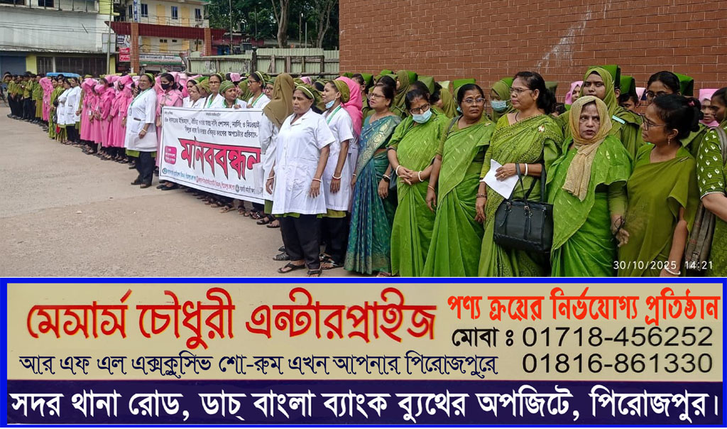 দেশব্যাপী স্বতন্ত্র নার্সিং প্রশাসন ও মিডওয়াইফারি অধিদপ্তরকে বিলুপ্ত করে অন্য কোনো অধিদপ্তরের সঙ্গে একীভূত করার উদ্যোগের প্রতিবাদে পিরোজপুরে মানববন্ধন অনুষ্ঠিত হয়েছে।