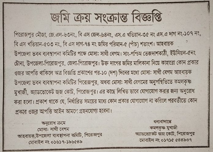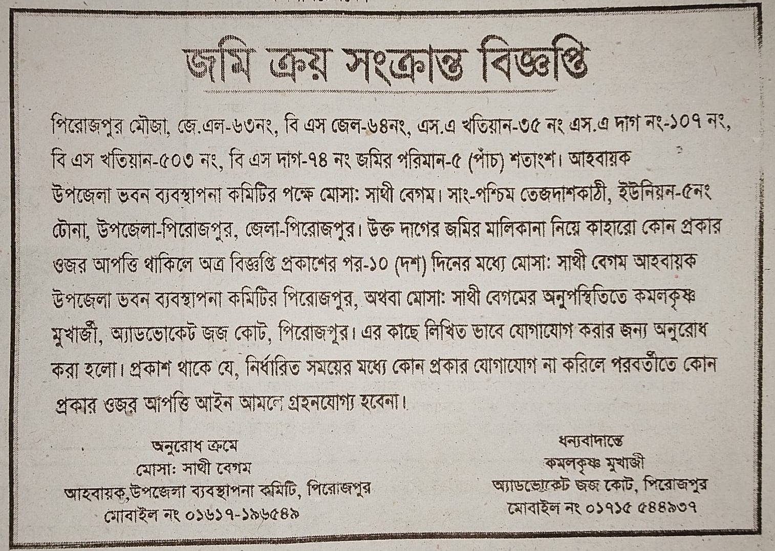 Homeপিরোজপুরপিরোজপুরে জমি ক্রয় সংক্রান্ত বিজ্ঞপ্তি ১০ ডিসেম্বর ২০২৫ খ্রি. পিরোজপুরবিজ্ঞপ্তিভূমি পিরোজপুরে জমি ক্রয় সংক্রান্ত বিজ্ঞপ্তি ১০ ডিসেম্বর ২০২৫ খ্রি. পিরোজপুরে জমি ক্রয় সংক্রান্ত বিজ্ঞপ্তি ১০ ডিসেম্বর ২০২৫ খ্রি. By jagotbangla December 10, 2025 0 24 Share FacebookTwitterPinterestWhatsApp জমি ক্রয় সংক্রান্ত বিজ্ঞপ্তি Sourceপিরোজপুরে জমি ক্রয় সংক্রান্ত বিজ্ঞপ্তি ১০ ডিসেম্বর ২০২৫ খ্রি. Share FacebookTwitterPinterestWhatsApp Previous articleকাউখালীতে নবান্ন উৎসব উদযাপনNext articleকাউখালীতে বেগম রোকেয়া দিবস পালিত jagotbanglahttps://www.jagotbangla.com RELATED ARTICLES কাউখালী কাউখালীতে বেগম রোকেয়া দিবস পালিত December 10, 2025 কাউখালী কাউখালীতে নবান্ন উৎসব উদযাপন November 26, 2025 ইন্দুরকানী ইন্দুরকানীতে ১৩ কেজি গাঁজাসহ পিকআপ ড্রাইভার আটক November 24, 2025 LEAVE A REPLY Cancel reply Comment: Please enter your comment! Name:* Please enter your name here Email:* You have entered an incorrect email address! Please enter your email address here Website: Save my name, email, and website in this browser for the next time I comment. - Advertisment - Most Popular কাউখালীতে বেগম রোকেয়া দিবস পালিত December 10, 2025 কাউখালীতে নবান্ন উৎসব উদযাপন November 26, 2025 ইন্দুরকানীতে ১৩ কেজি গাঁজাসহ পিকআপ ড্রাইভার আটক November 24, 2025 পিরোজপুরে গণপিটুনিতে ডাকাতের মৃত্যু November 24, 2025 Load more Recent Comments