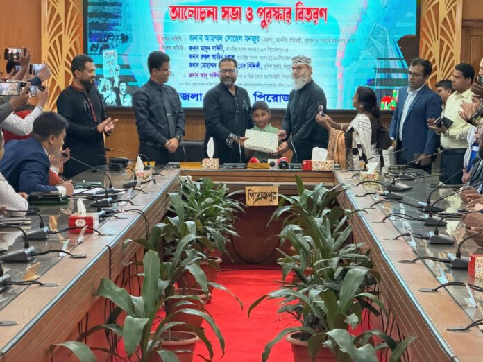 মহান শহিদ দিবস ও আন্তর্জাতিক মাতৃভাষা দিবস উপলক্ষে পিরোজপুরে জেলা প্রশাসন আয়োজনে শহিদ মিনারে পুষ্পস্তবক অর্পণ, আলোচনা সভা ও পুরস্কার বিতরণ অনুষ্ঠান অনুষ্ঠিত হয়েছে। শুক্রবার (২১ ফেব্রুয়ারি) জেলা প্রশাসকের সম্মেলন কক্ষে আয়োজিত এ অনুষ্ঠানে প্রধান অতিথি হিসেবে উপস্থিত ছিলেন গণপ্রজাতন্ত্রী বাংলাদেশ সরকারের গৃহায়ন ও গণপূর্ত মন্ত্রণালয়ের মাননীয় প্রতিমন্ত্রী আহম্মদ সোহেল মনজুর এমপি। বিশেষ অতিথি হিসেবে উপস্থিত ছিলেন পিরোজপুর-১ আসনের মাননীয় সংসদ সদস্য মাসুদ সাঈদী এবং পিরোজপুরের পুলিশ সুপার মোহাম্মদ মনজুর আহমেদ সিদ্দিকী।