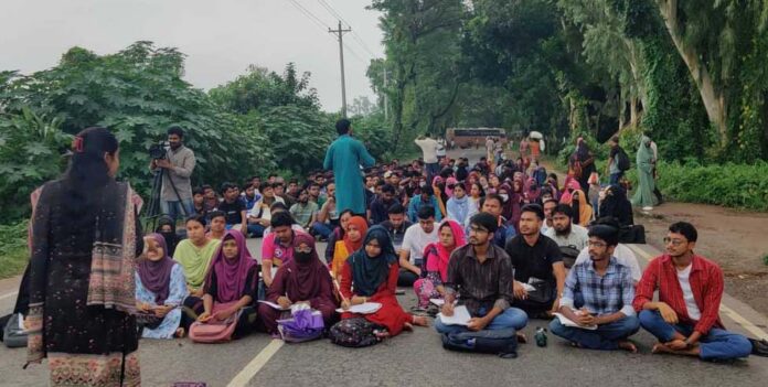 সিরাজগঞ্জের শাহজাদপুরে রবীন্দ্র বিশ্ববিদ্যালয়ের শিক্ষার্থীরা ব্যতিক্রমী এক আন্দোলনের নজির স্থাপন করেছেন। নিজস্ব ক্যাম্পাস নির্মাণের দাবিতে তারা মহাসড়ক অবরোধ করে প্রতীকী পাঠদানের মাধ্যমে আন্দোলনের নতুন রূপ দিয়েছেন। সোমবার (২৮ জুলাই) সকাল ১০টা থেকে সাড়ে ১১টা পর্যন্ত ঢাকা-পাবনা মহাসড়কের ওপর চলেছে এই কর্মসূচি। এতে অংশ নেন বিশ্ববিদ্যালয়ের শিক্ষক, শিক্ষার্থীসহ সংশ্লিষ্টরা।