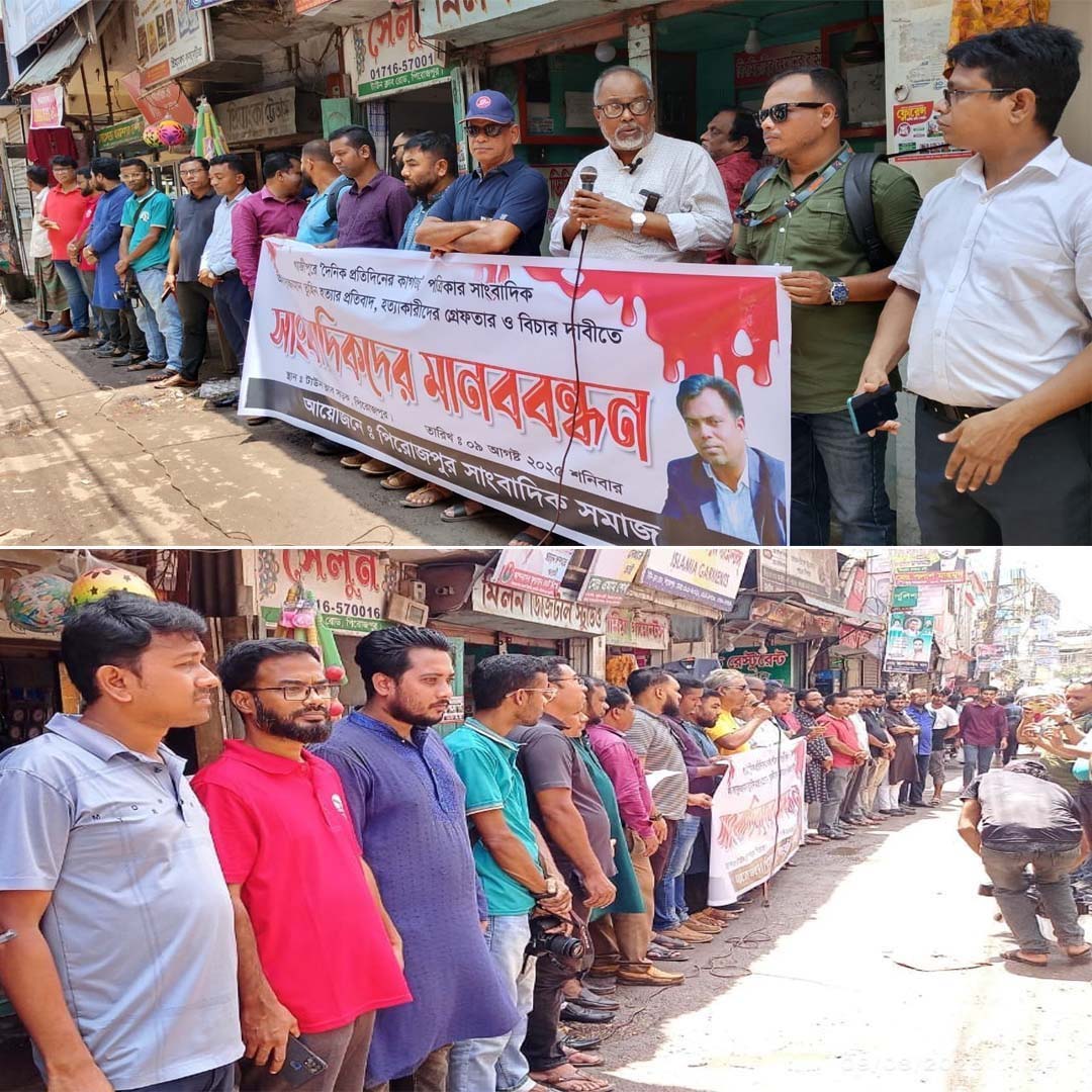 শনিবার (৯ আগস্ট) সকাল ১০টায় শহরের টাউন ক্লাব সড়কে সম্মিলিত পিরোজপুর সাংবাদিক সমাজের উদ্যোগে এ মানববন্ধন কর্মসূচি পালিত হয়। এতে জেলার বিভিন্ন উপজেলা ও জাতীয়-আঞ্চলিক গণমাধ্যমের সংবাদকর্মীরা অংশ নেন।